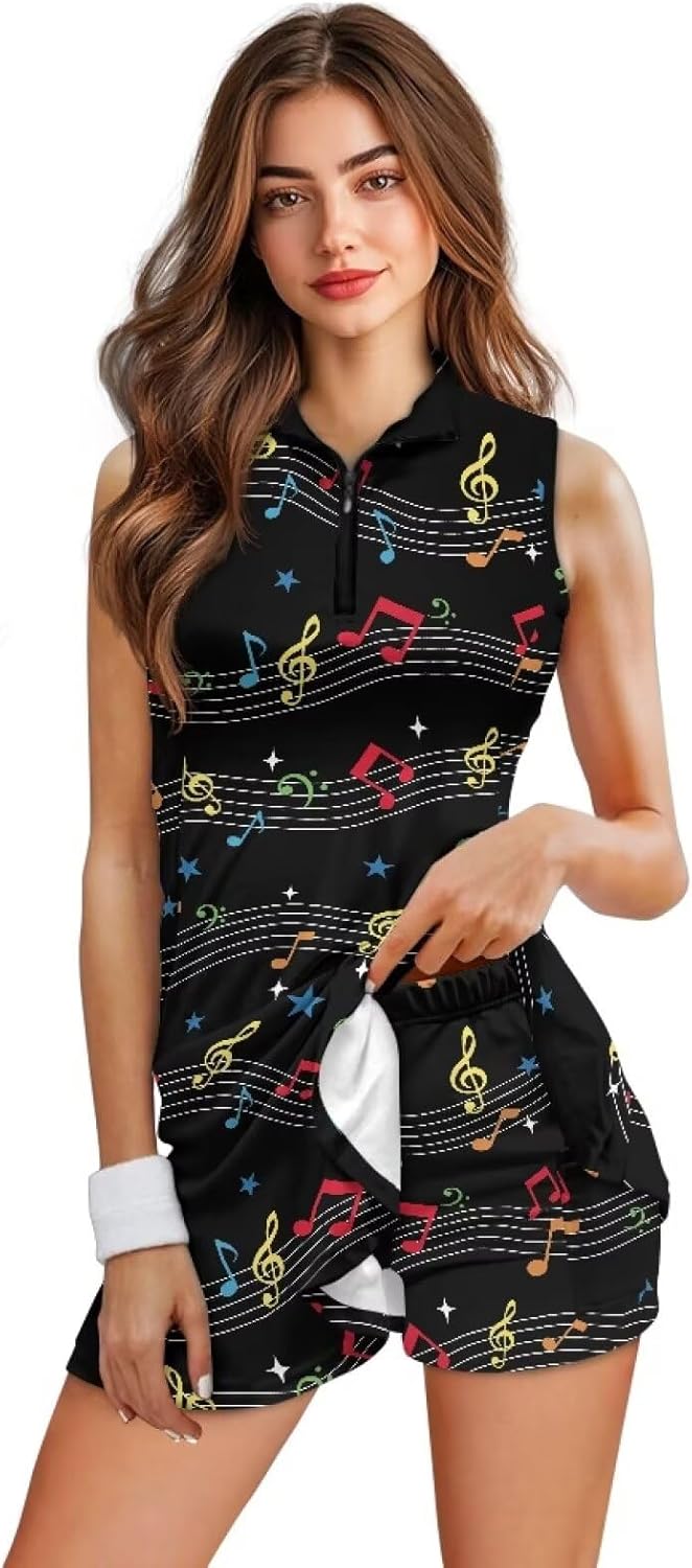 Suhoaziia's Sleeveless Tennis Dresses with Shorts and Pockets Summer Fashion Pickleball Golf Outfits 2 Pieces Sports Athletic Workout Dress for Women Ladies Features: Slim fit, sleeveless, ruffle hem, half zipper, pullover, collared neckline, short length, 4-way stretchy fabric, moisture wicking, sun protection Size: We have 6 sizes for you to choose: XS-2XL, please refer to the size chart before ordering to choose the size you want. Please allow 1-2 cm error due to the difference measurement method. Multicolor Pattern: Stylish print brings you a new experience, we have a variety of fun print for you to choose from, such as rooster, dog paws, hippie flowers, sunflower, strawberry, cow print, floral, love hearts and so on. If you want something different, try our casual sports dresses! Occasion: Fit for any occasion, such as casual, work/business/office, yoga, jogging, walk, dance, tennis, golf, exercise, fitness, running, lounge, sports, daily, outdoor activities wear etc. Ideal Gifts: The Sports Dress is a beautiful and sweet gift option for your girlfriend, wife, mother, sister, daughter or friends. Birthday, Mother's Day, Valentine's Day, Thanksgiving, Christmas, Halloween, New Year, Anniversary and any other holiday & daily gifts. Easy to care, suitable for all seasons.