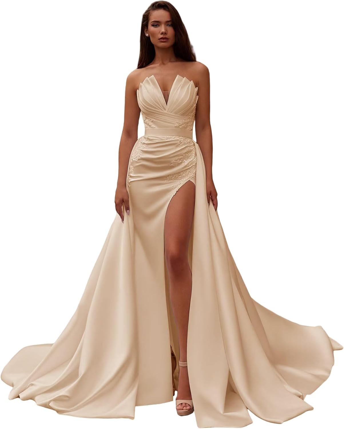 Item Description: This Plus Size Beach Wedding Dresses for Brides Strapless Sleeveless Satin Beaded Lace Applique Mermaid Sparkly V-Neck Bridal Gowns with Detachable Train shows the sexy and elegant beauty of bride, is every bride deserves to have. Custom Made: Dresses can be made according to your measurements with no more charges,the measurements we need is:1.Bust 2.Waist 3.Hips 4.Hollow(or Shoulder) to Floor 5.The height of your high heel shoes. Occasion:Prom Dresses, Party Dress, Formal, Evening, Concert, Black Tie, Ball, Cocktail,and so on Waistline:Natural DecorationThe detachable hemline makes this dress adaptable to all occasions, and the split hemline allows you to dance and run around at your own pace! Fabric Type:Satin Dresses Length:Long with Detachable Train